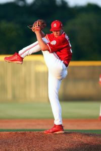 腕を上に大きく振りかぶって、ダイナミックなフォームで投げる姿を
